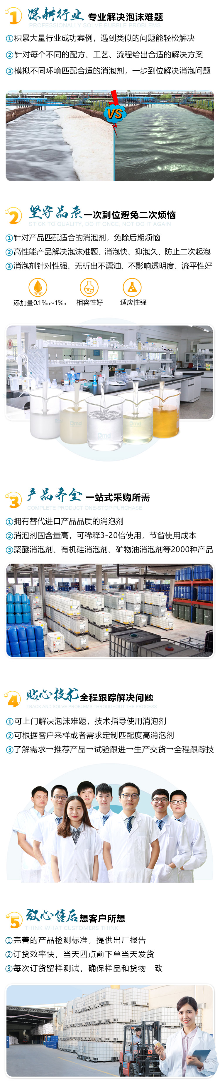 多年來公司面向市場,面向真實各行業(yè)客戶現(xiàn)場,對水處理消泡劑、工業(yè)消泡劑、有機硅消泡劑、發(fā)酵行業(yè)、清洗劑行業(yè)、金屬加工行業(yè)、造紙行業(yè)、建材行業(yè)、水性粘合劑行業(yè)、紡織印染行業(yè)、油田行業(yè)、水性涂料行業(yè)、印刷材料行業(yè)、電廠脫硫行業(yè)、工業(yè)清洗行業(yè)、家用化學(xué)品行業(yè)、采礦選礦工行業(yè)等32個行業(yè)工藝、流程及產(chǎn)品配方深入了解,對各行業(yè)消泡劑應(yīng)用了如指掌,給能客戶提供合適的解決方案,所研發(fā)生產(chǎn)消泡劑適應(yīng)客戶需求和市場需要,能輕松解決客戶遇到的難以解決的消泡難題,減少了客戶使用消泡劑的成本。公司依托完善的售前、售中及售后服務(wù),全程技術(shù)跟進消泡劑的試樣到使用過程,節(jié)省了時間和成本,贏得了業(yè)界各類客戶們的贊譽!